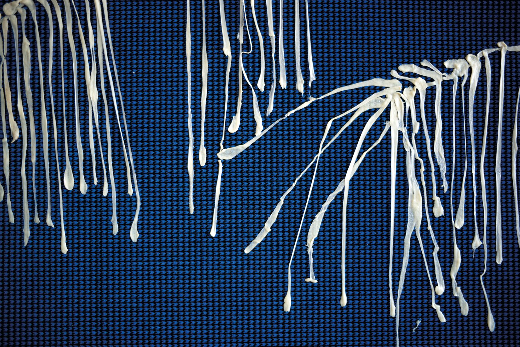 Chewing (gum) is waiting and contemplating, something to do while in limbo. Also a short moment of fresh breath. The lines marking the fabrics are made by pressing the chewing gum on the plush surfaces, as we all have done secretly on busses before.