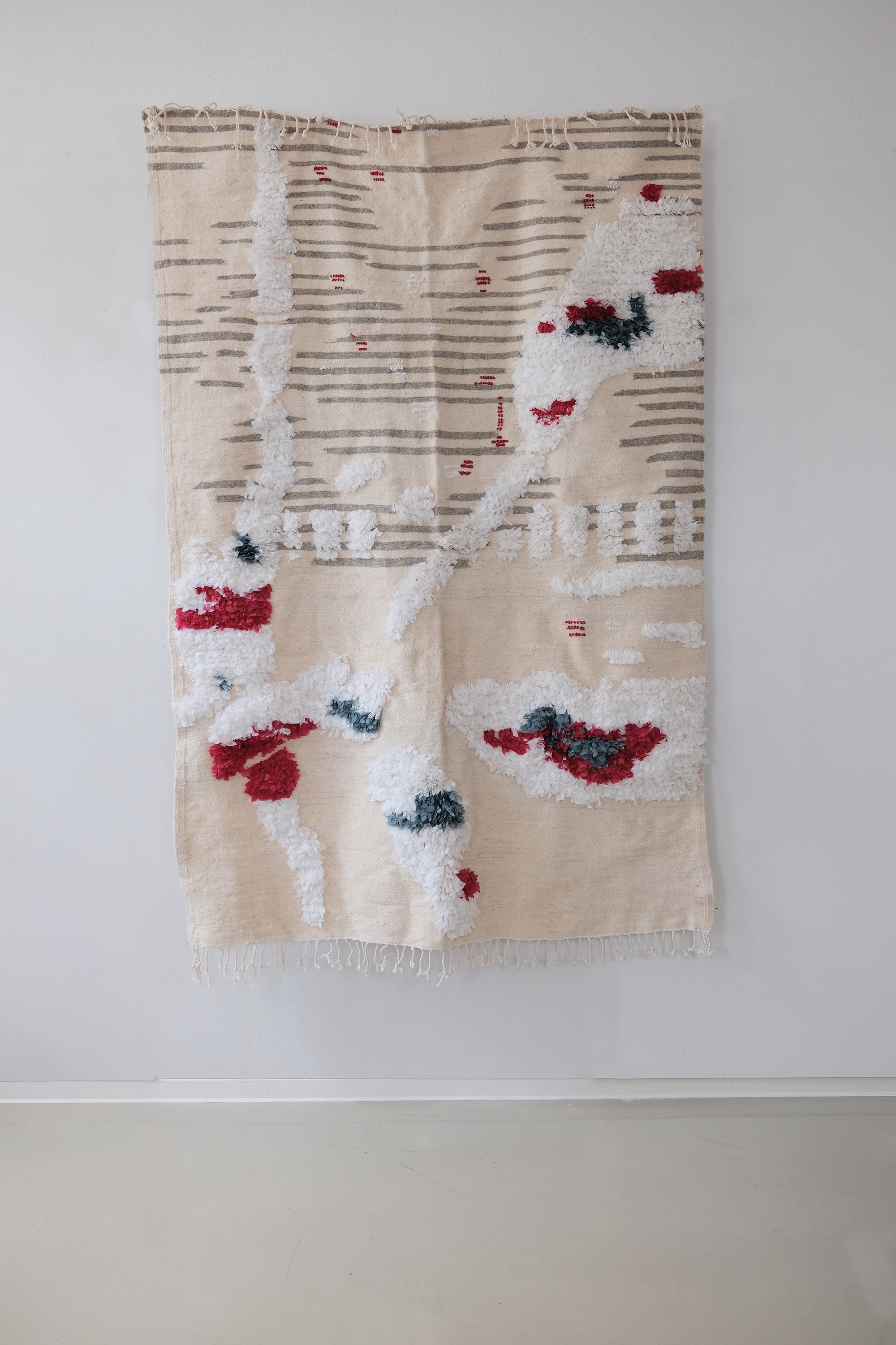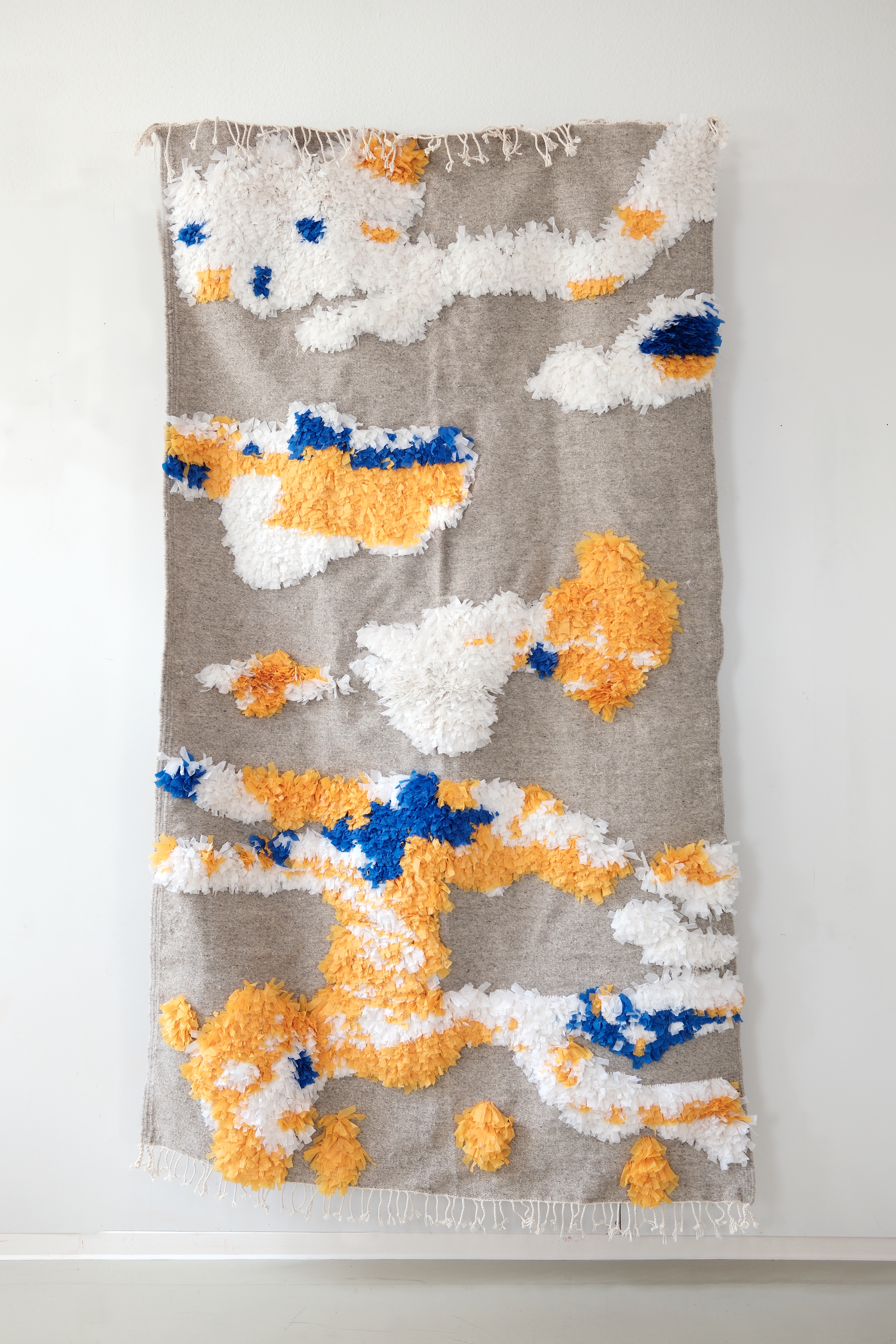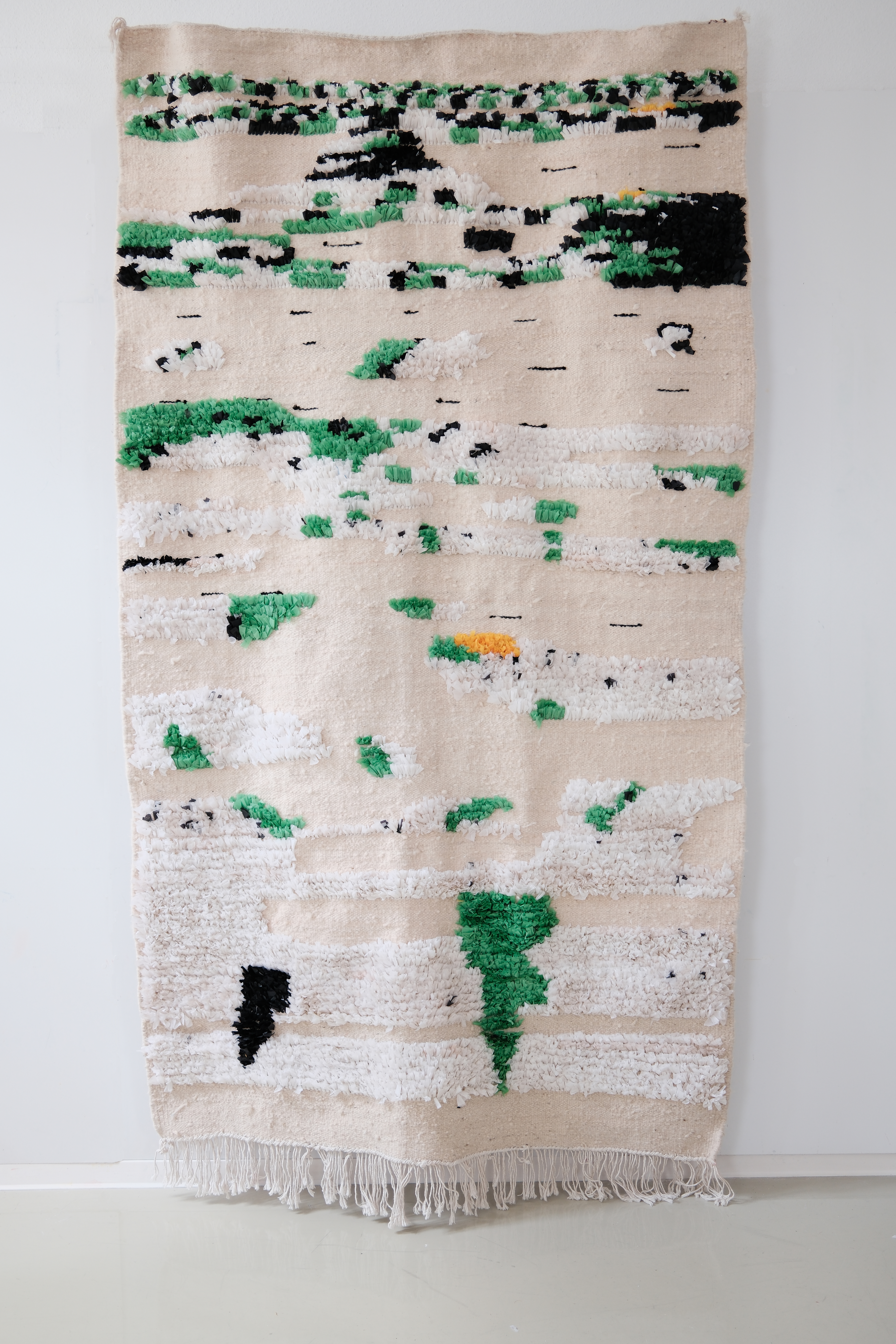 The tapestries were made by using the fabric of one entire paraglider and wool. The glider was flown once over the Alps in Switzerland, cut, and brought to the Atlas Mountains in Morrocco. There, they were transformed into hand-knotted carpets. Started in 2018, the project was on hold till 2023 due to COVID.