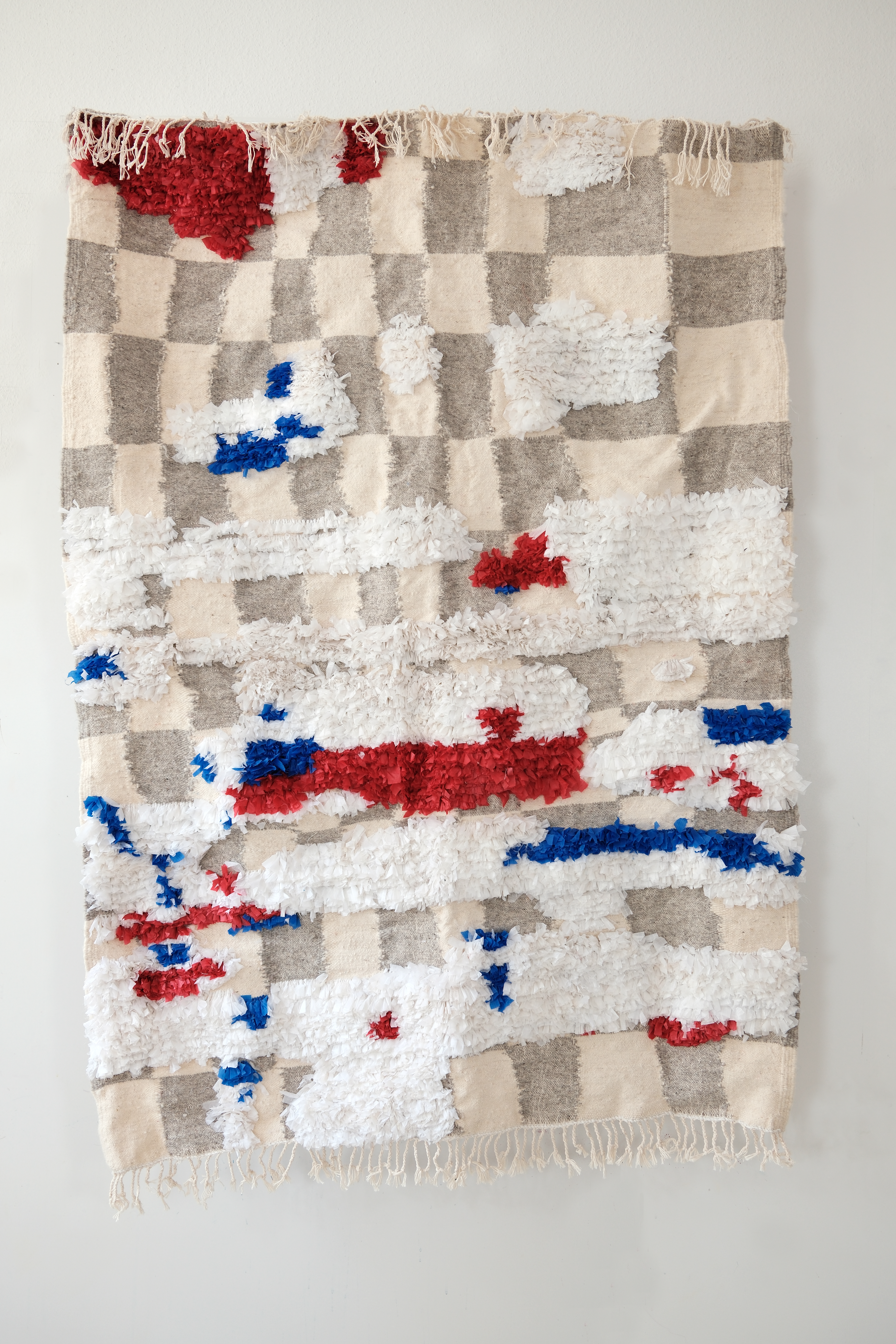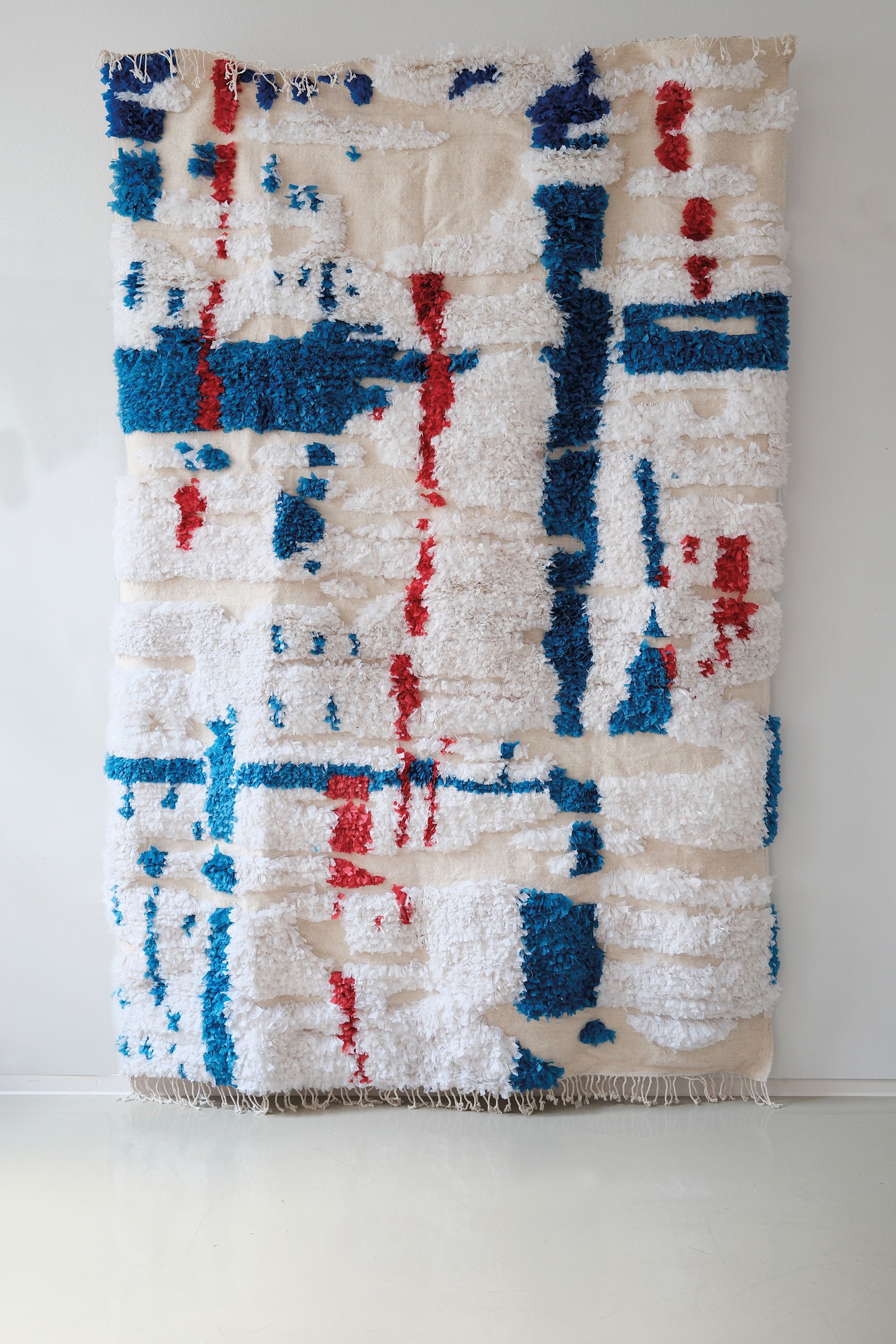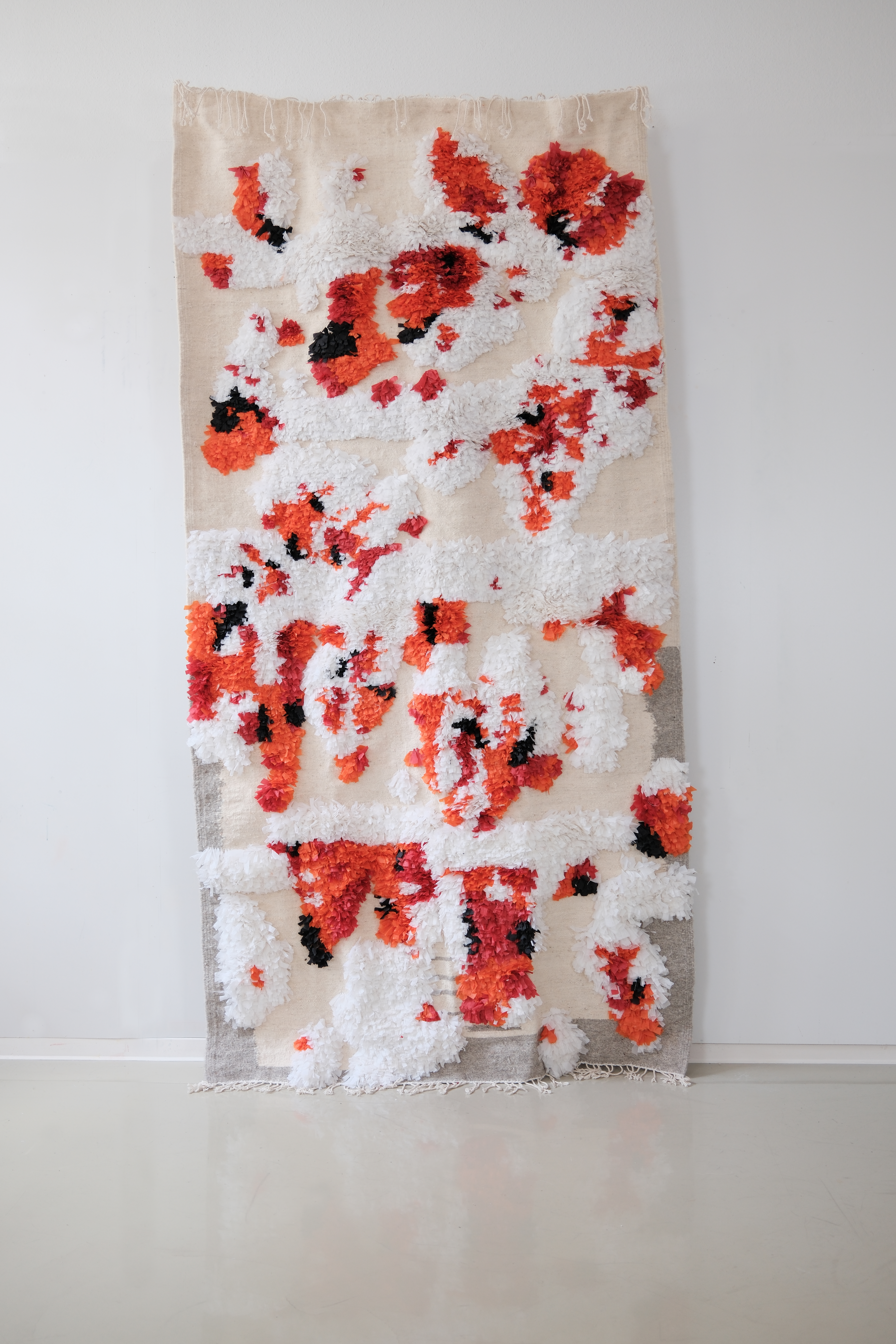 The tapestries were made by using the fabric of one entire paraglider and wool. The glider was flown once over the Alps in Switzerland, cut, and brought to the Atlas Mountains in Morrocco. There, they were transformed into hand-knotted carpets. Started in 2018, the project was on hold till 2023 due to COVID.