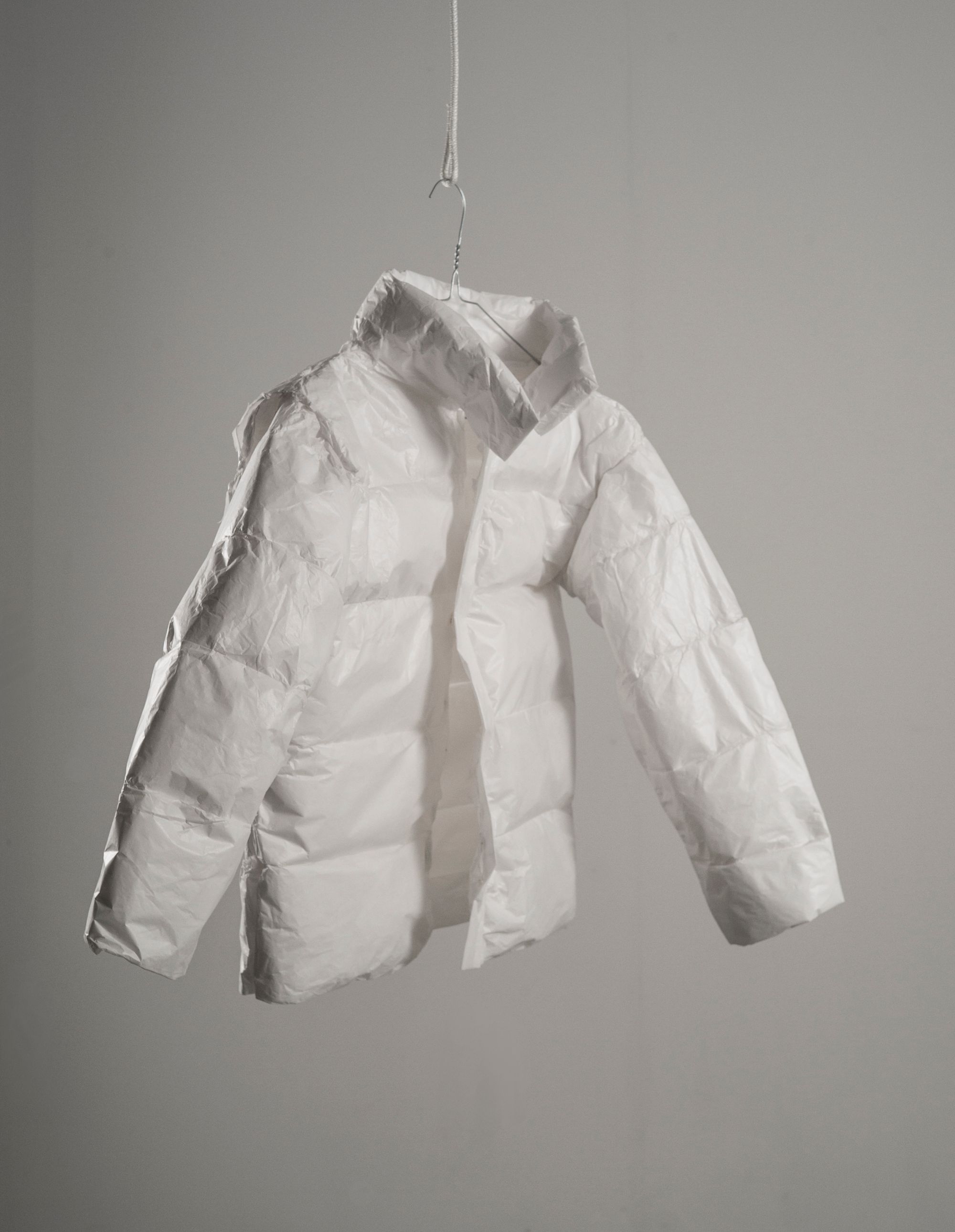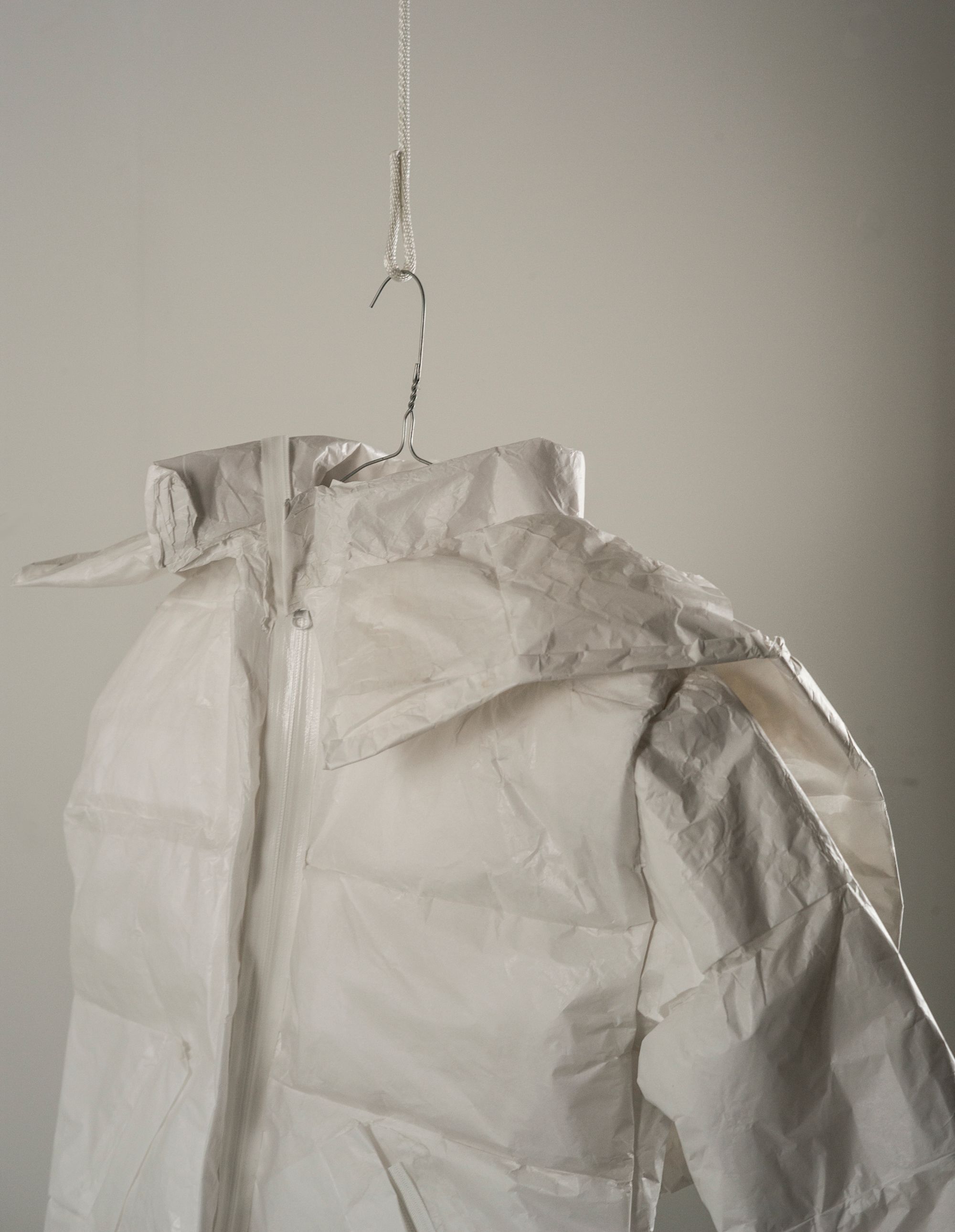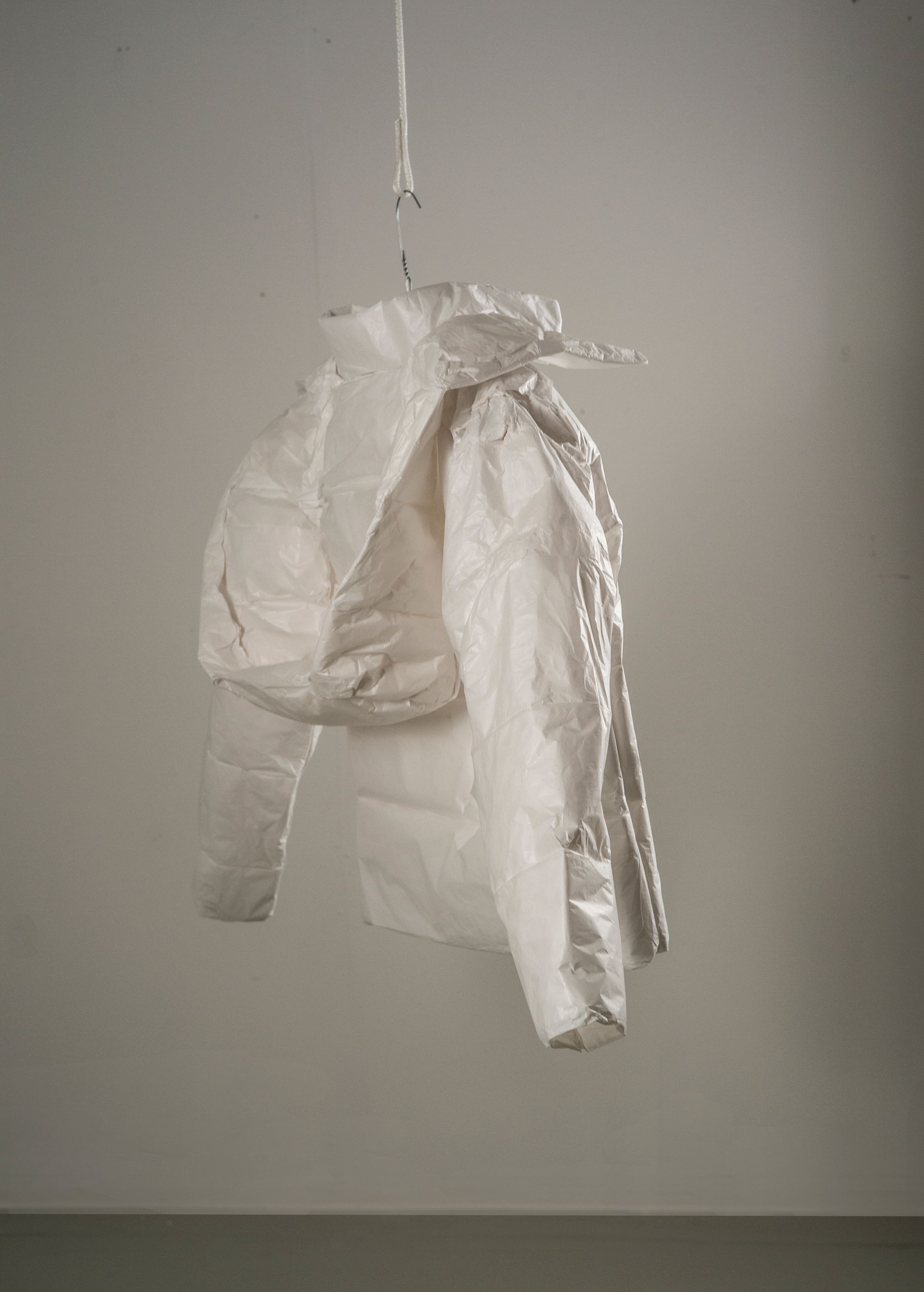To Protect Us From What We Seek also features a series of sculptures made entirely out of silkpaper. The objects, all white, are like a blueprint for an object created to protect us, stripped from their purpose and strenght. The only thing left is the shape and form of the outdoor tools, like an empty cocoon.